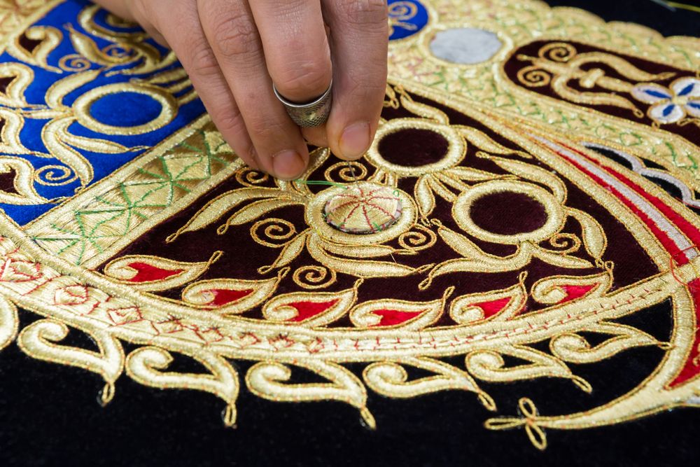 Небольшое пространство с очень камерной атмосферой: стены и стеллажи заполнены вышивками, а работа идёт прямо при посетителях. Здесь можно увидеть, как создают сюзане, и расспросить мастеров о значении орнаментов и отдельных символов.
