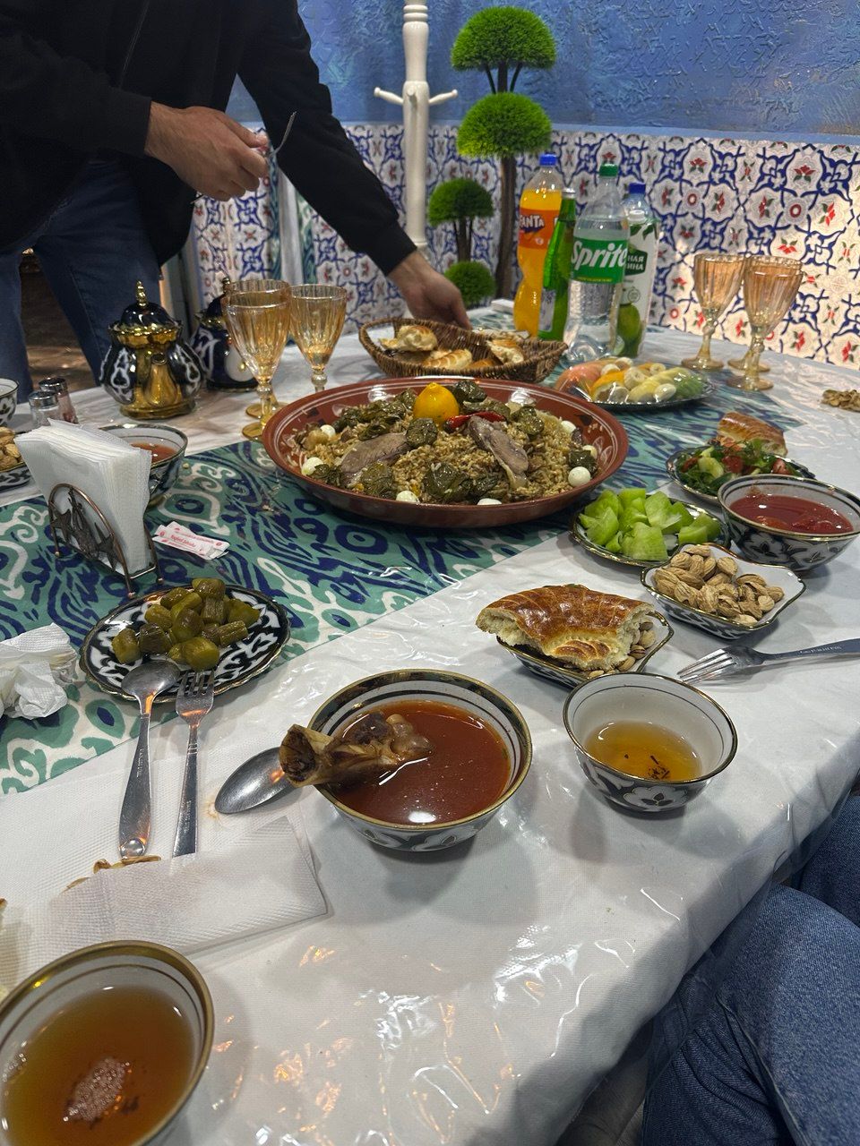 С едой в Фергане всё просто: выбор большой. Есть современные рестораны вроде «Трактир Остров Сокровищ» и WINE GARDEN, много заведений с турецкой кухней, а ещё — уличная еда (самса, хот-доги, вкусности на базаре), если хочется быстро и недорого.