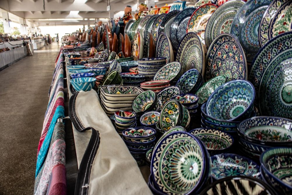Ещё один вариант — риштанская керамика. Чаще всего берут ляганы (большие блюда для плова) или пиалы. Обратите внимание на изделия с лазурной глазурью «ишкор» — это один из узнаваемых местных стилей.