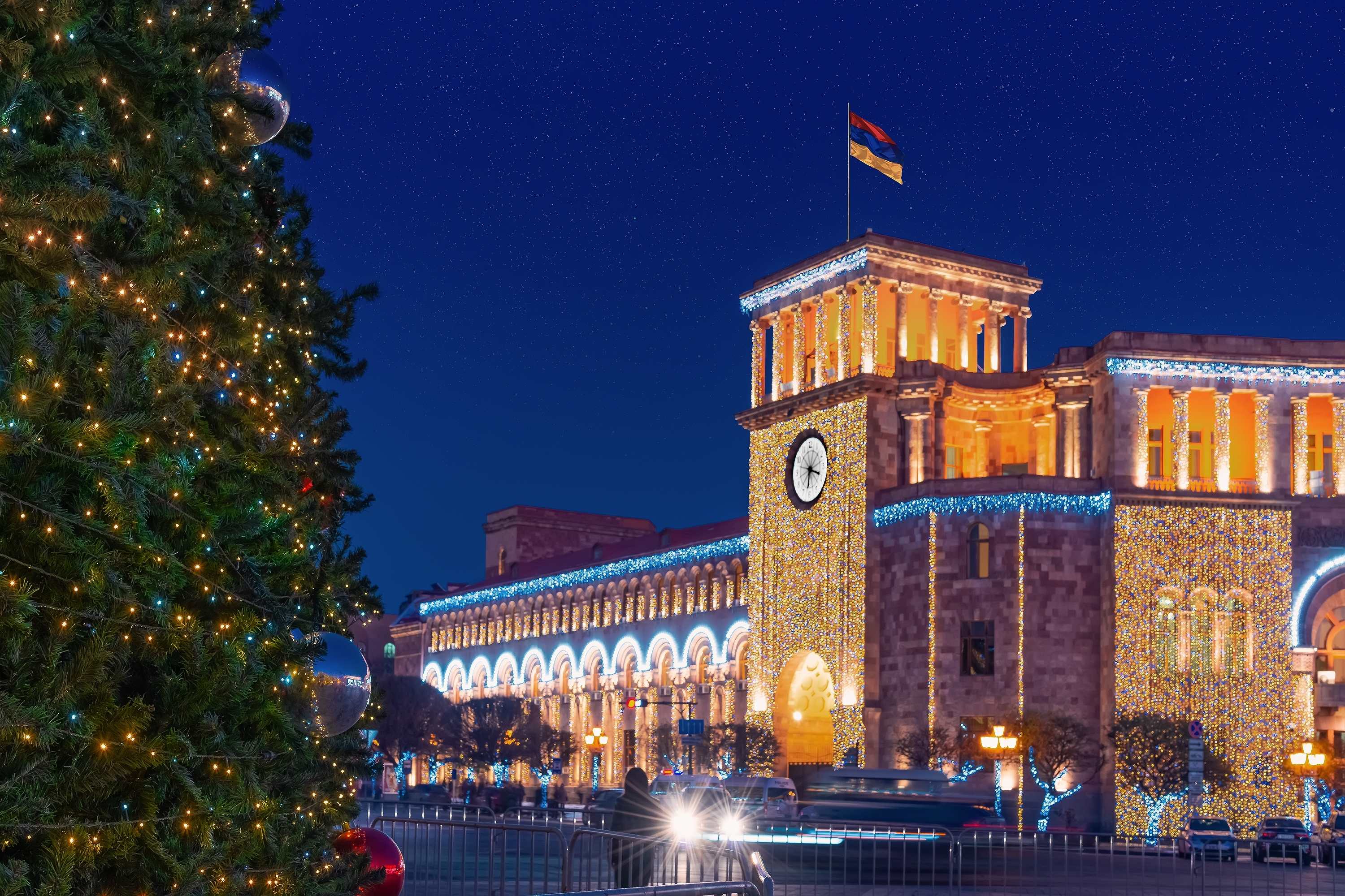 В Армении отмечают и 31 декабря, и Рождество 6 января, поэтому на протяжении всех праздников Ереван выглядит по-особенному: центр города ярко подсвечен, на площади Республики стоит главная ёлка, работает каток под открытым небом.