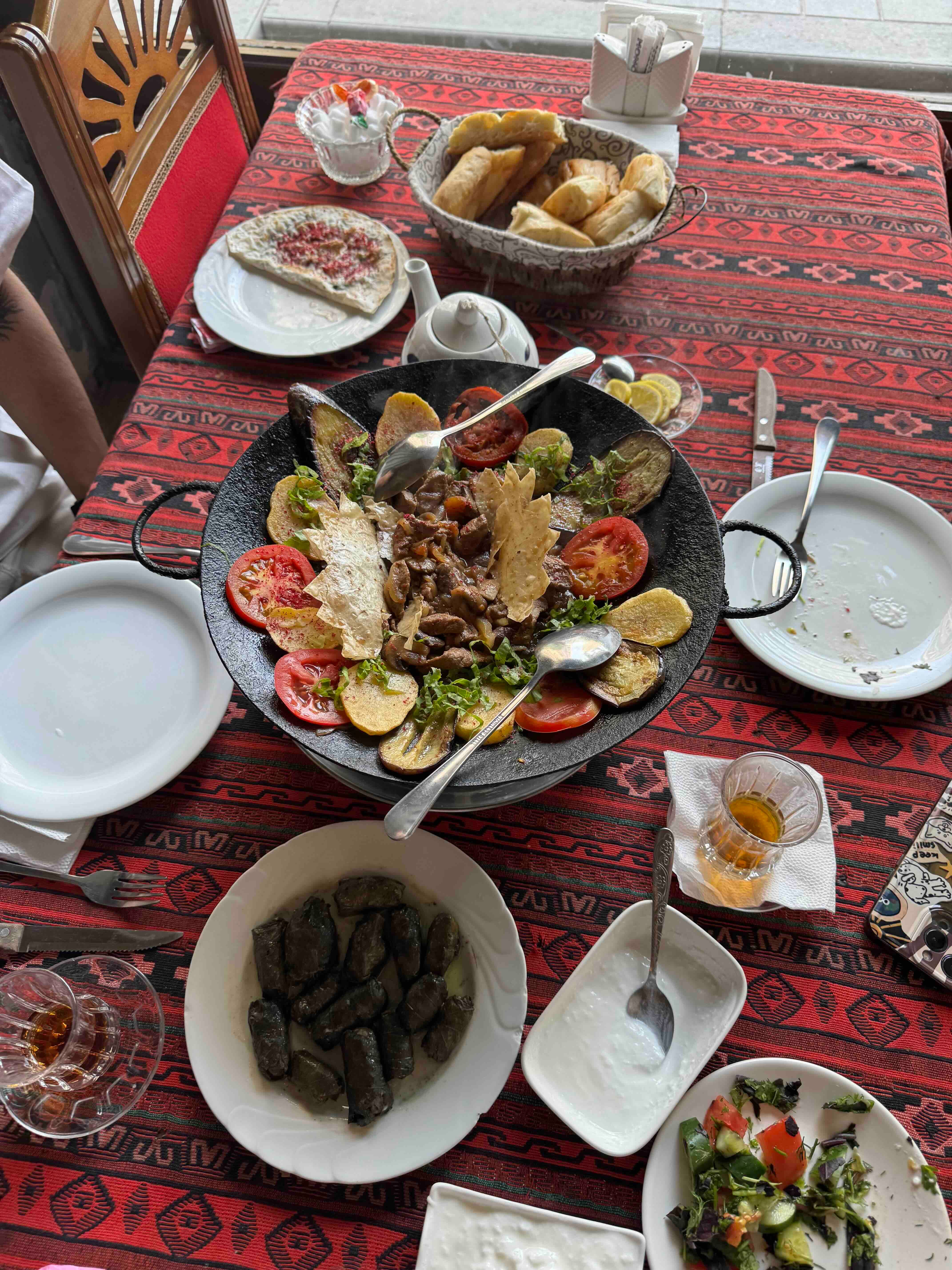 Первым делом в Баку мы пошли пробовать местную кухню в ресторане Samik. Взяли садж — баранину, обжаренную с овощами на специальной сковороде. Это был, пожалуй, лучший первый ужин в новой стране в моей жизни. Но завтрак в старом городе в кафе «Сехрли Тандыр» его превзошёл. Только представьте: омлет с томатами, азербайджанский чай, свежий сыр, мёд, оливки.
