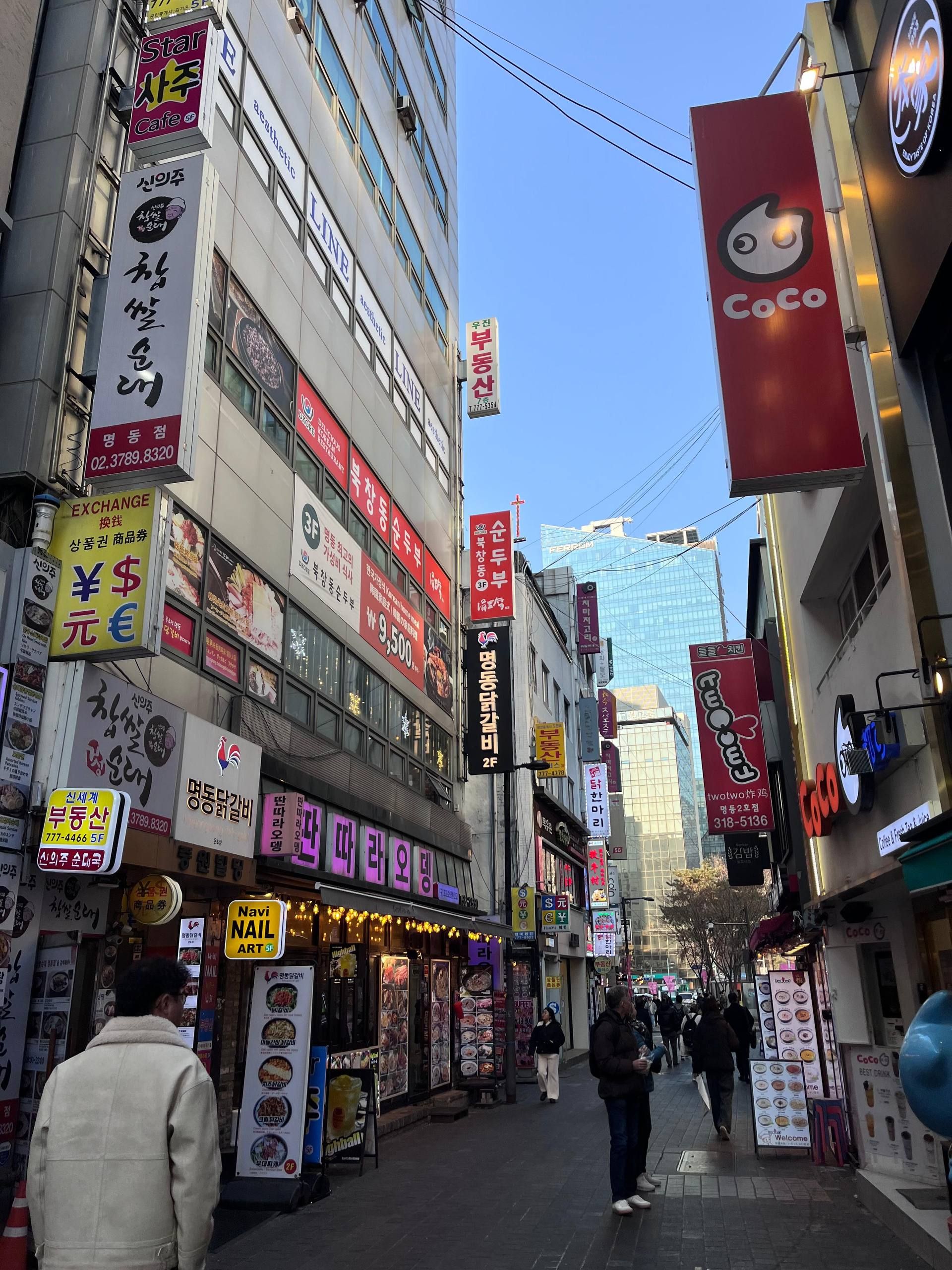 Bu asosiy turistik manzil — har qadamda kosmetika, kiyim-kechak do‘konlari, univermaglar va ko‘cha yeguliklari. Bu yerda koreys brendlaridan tortib, dunyo miqyosidagi gigantlarning mahsulotlarigacha bor. Oqshomda ko‘chalar yegulik solingan aravalarga to‘lib ketadi, barlar va klublar ochiladi. Bu yerda kechasiyu kunduzi hayot qaynaydi.