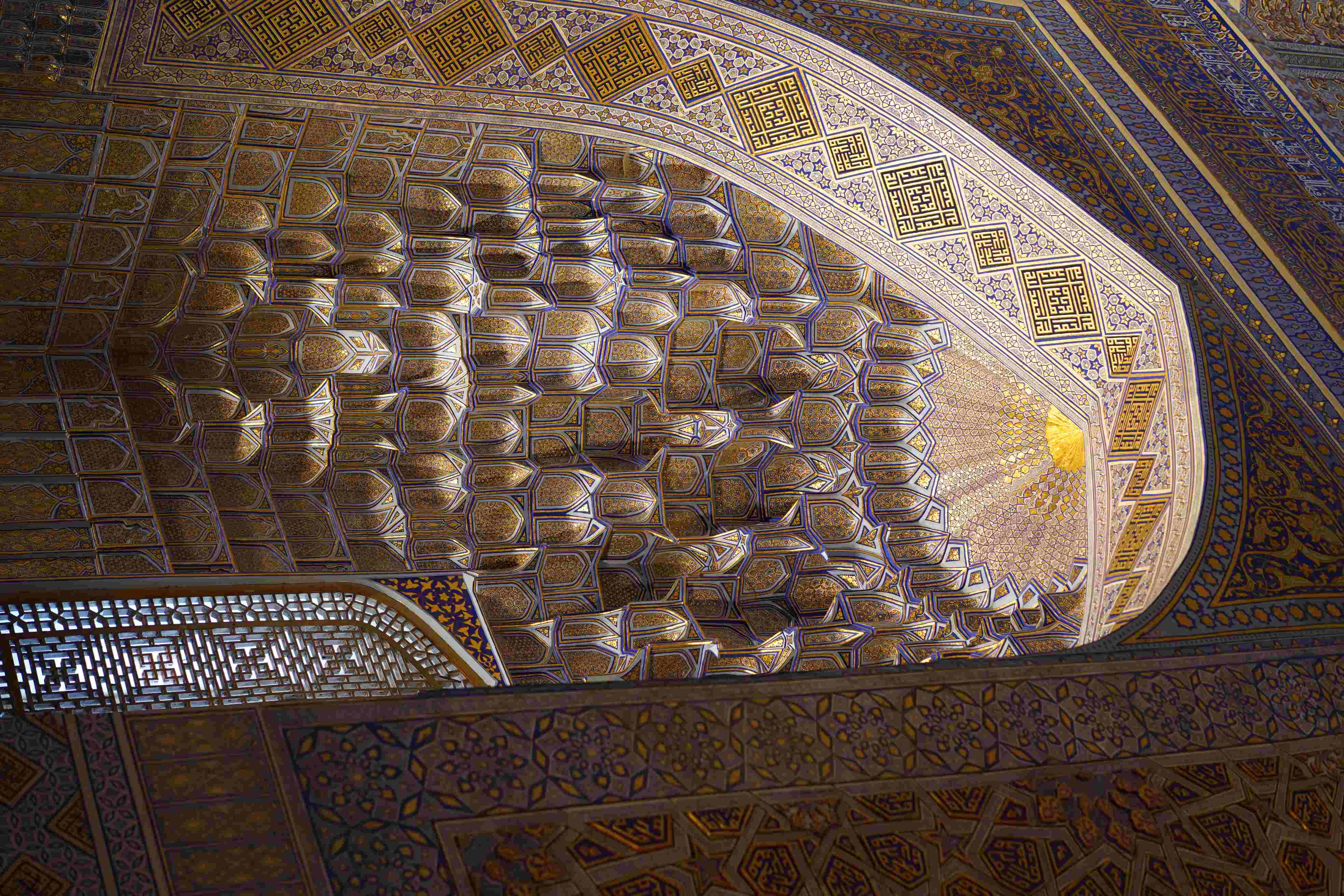 - Sherdor madrasasi (XVII asr) – «arslon-yo‘lbarslar» va quyosh tasvirlangan mozaika pannolari bilan tanilgan. Jonivorlar tasviri islom me’morchiligida kamdan kam uchraydi;
